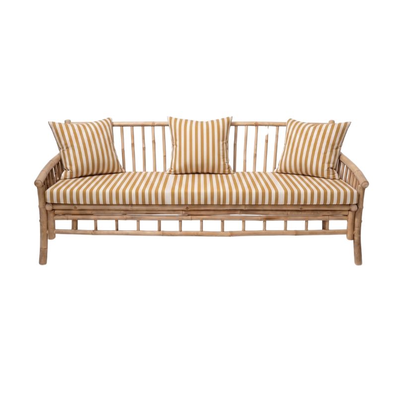 Este sofá de diseño natural combina la calidez del bambú con la frescura de sus cojines a rayas en tonos beige y mostaza, creando una pieza perfecta para ambientaciones con estilo mediterráneo, boho o tropical.