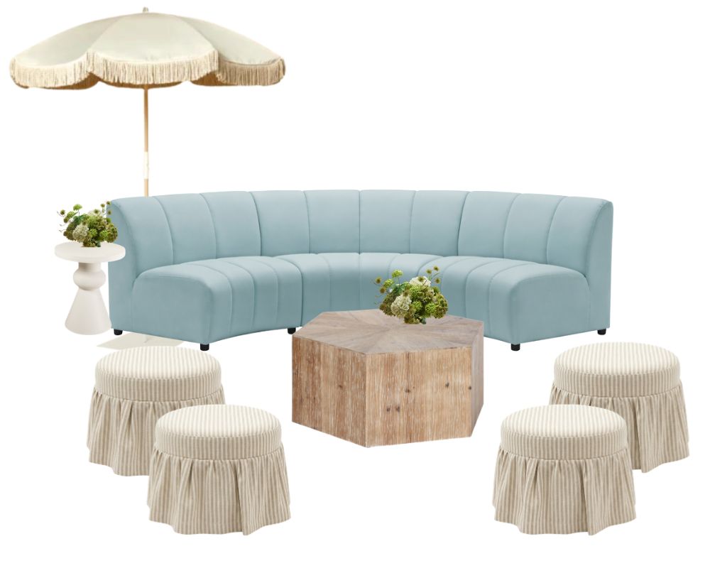 Descubre Brisa Lounge, una zona chill out diseñada para crear ambientes acogedores, naturales y con un toque sofisticado. Este conjunto combina un elegante sofá curvo en tonos suaves con piezas auxiliares cuidadosamente seleccionadas, logrando un equilibrio perfecto entre confort y estilo.